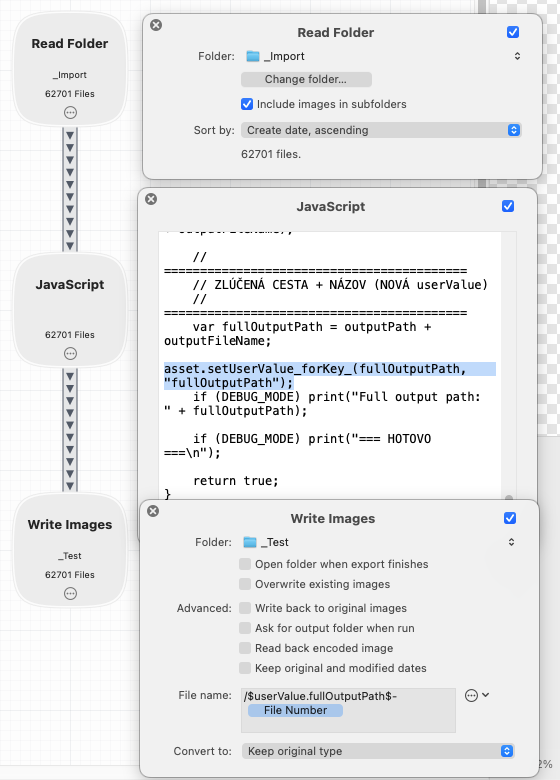 JavaScript node is used for advanced filtering (mostly if file contains some date in metadata or file name) and is generating a $userValue.fullOutputPath variable which
